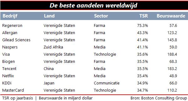 Het merendeel van de zogeheten Global Leaders komt uit de Verenigde Staten en de Global top-10 blijkt te worden gedomineerd door de farmaceutische industrie en mediabedrijven