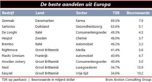Omdat de bedrijfsadviseurs van BCG per sector een top-10 opstellen, volgt hieronder het overzicht met de tien Europese aandelen met het hoogste totaalrendement voor aandeelhouders. En zoals de bekende disclaimer van de Autoriteit Financiële Markten (AFM) zo mooi betoogt: historische rendementen bieden geen garantie voor de toekomst, ook niet als zij betrekking hebben op langere periodes.