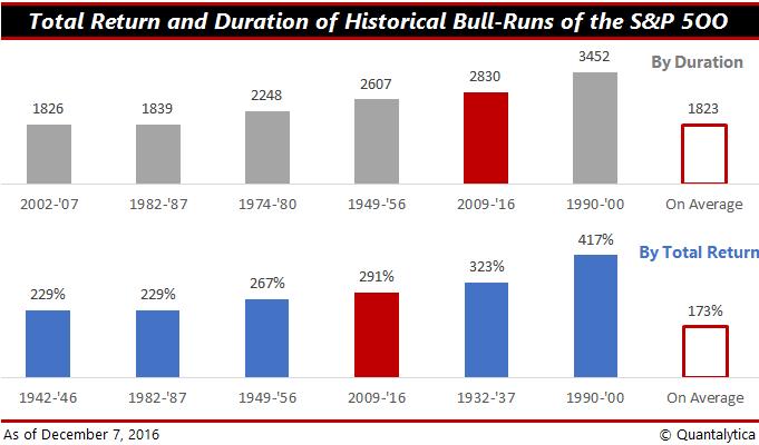 Als u naar de lengte kijkt van de huidige bull-run, dan is het een kwestie van tijd voordat de markten koers uitzetten naar het zuiden. Vanaf de bodem in maart 2009 is de S&P500 ruw geschat met 300% gestegen en qua tijd is het de op twee na de langste bullmarkt van de afgelopen 100 jaar.