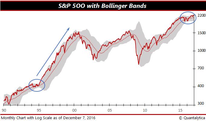 De laatste tijd echter lijkt het wel dat de koersschommelingen steeds kleiner worden. Niet alleen de VIX, de bekende volatiliteitsindex én angstbarometer van de S&P500 en dus ook Wall Street, kabbelt al maandenlang rond de 15, ook de variatiebreedte van de Bollinger-banden geeft aan dat de volatiliteit behoorlijk is afgenomen. De vorige keer dat er sprake was een dergelijke versmalling, was medio jaren negentig. Nadat destijds de stier op adem was gekomen, ging de S&P500 vlot hoger, totdat in het illustere jaar 2000 de internetzeepbel knapte.