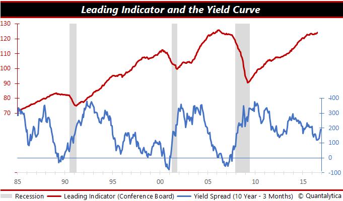 In het verleden voorspelde de rentecurve accuraat alle recessies. Als de termijnstructuur negatief is, volgt in de regel tussen de 9 en 15 maanden een periode van economische neergang. Momenteel wijst het renteverschil niet op een correctie. Dat het voorspoedig gaat met de economie, wordt bevestigd door de leading indicator. De vooruitlopende economische indicator van de Conference Board kondigt elke recessie vooraf aan met een forse terugval. En dat is nu niet het geval.