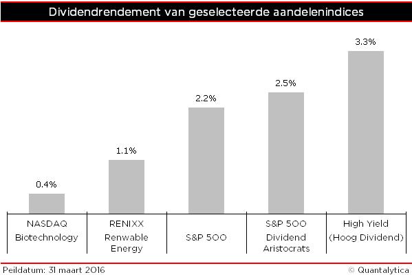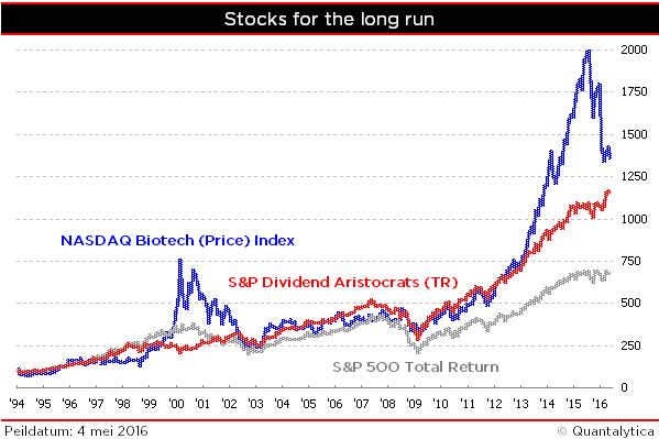Echter, als je nu of binnenkort van je aandelen moet leven, dan kun je beter je vermogen verdelen over 1) aandelen met een hoog dividend, omdat je dan meteen verzekerd bent van inkomen, 2) kwaliteitsaandelen waarvan het dividend met regelmaat groeit (tot hoog dividend) en 3) biotechnologie.