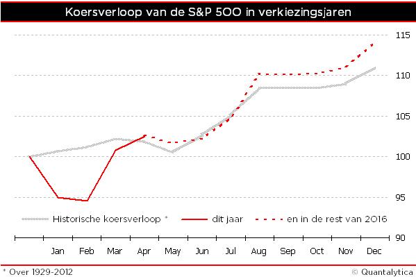 De vraag van een miljoen is of dit jaar de wetmatigheid van de presidentscyclus opgeld biedt, want vorig jaar boekte de S&P 500 amper winst, zelfs met het dividend nog erbij opgeteld. Bovendien tonen de beurzen na de stevige rally tot de toppen van vorig jaar weinig fut. Het lijkt erop dat zij wachten op de volgende beweging. Dat kan omhoog of omlaag zijn. Weet echter dat naarmate de Amerikaanse presidentsverkiezingen naderbij komen, Wall Street steeds beter begint te presteren en daarbij met regelmaat de Europese aandelenmarkten outperformt.