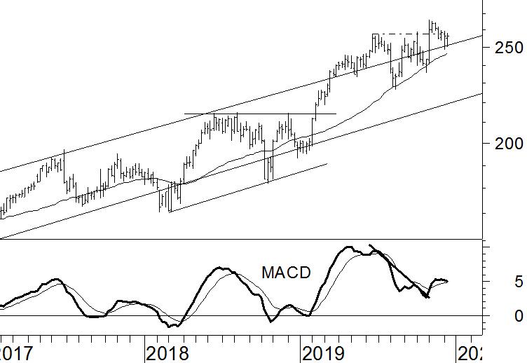 L’Oréal staat sinds februari op ‘kopen’. De koers brak toen door de horizontale weerstand op €214. Inmiddels staat de winst van de longpositie op ongeveer 17% en is er allerminst reden om afscheid te nemen van het aandeel. De koers is namelijk vlak na de doorbraak nog uitgestegen boven een breed stijgend trendkanaal waarin die lange tijd heeft bewogen. Normaal gesproken betekent zo’n opwaartse uitbraak uit een stijgend kanaal dat de koers in een hogere versnelling gaat stijgen. Zover is het nog niet. De koers kleeft nog aan de bovenkant van het kanaal, conform het adagium ‘oude weerstand wordt nieuwe steun’. Het is mooi om te zien dat bij de laatste twee correcties de koers keurig steun vond op het stijgende 40-weeks voortschrijdende gemiddelde. Dit gemiddelde biedt vaak steun bij neerwaartse correcties in een stijgende trend.