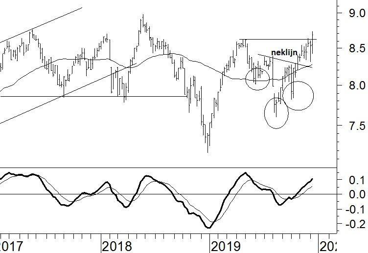 Het is snel gegaan met de FTSE100 de laatste weken. Nadat een principeakkoord tot stand kwam over de brexit, is de koers van de belangrijkste index in het VK hard opgelopen. Na de verkiezingen, waarbij Boris Johnson een duidelijke overwinning boekte, is het herstel verder gegaan. Daarbij is zelfs een belangrijke horizontale weerstand doorbroken, waardoor de index weer koopwaardig is geworden. Al voor de uitbraak door de weerstand was er een aanzienlijke verbetering in het koersbeeld te zien. Er heeft zich namelijk een bekend bodempatroon, in de vorm van een omgekeerde hoofd-en-schoudersformatie, voorgedaan. Dit patroon werd voltooid toen de koers eind oktober door de licht dalende neklijn brak. Het omgekeerde hoofd vormde zich in augustus. De koers heeft nu aardig wat ruimte om te stijgen. De top uit het voorjaar van 2018 vormt nu de eerste weerstand.