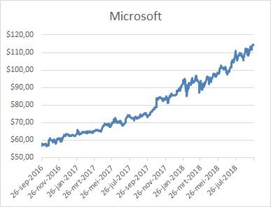 Ook dividendportefeuilleuitblinker Microsoft verhoogde zoals verwacht opnieuw het dividend. Wel gebeurde dat met +9,5% tot $0,46 per kwartaal iets minder uitbundig dan ik had verwacht. Het is alweer het zestiende opeenvolgende jaar dat Microsoft het dividend verhoogt. Op de beurs blijft het aandeel uitstekend presteren met in 2018 inmiddels een koerswinst van 34%. In september werd een voorlopig nieuwe hoogste koers ooit neergezet op iets meer dan $115. Daarmee komt de beurswaarde uit op liefst $879 mrd en biedt het nieuwe dividend op jaarbasis een geschat rendement van 1,6%.