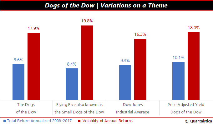De fraaie resultaten van de Dogs of the Dow inspireerde menig belegger om de onderliggende theorie te verfijnen. In het boek Beating the Dow presenteert Michael O’Higgins een aantal varianten waarvan de Flying Five, beter gekend als Small Dogs, de bekendste is. Hierbij koopt men simpelweg de vijf goedkoopste (lees: laagst geprijsde) aandelen uit het tiental met het hoogste dividendrendement uit de Dow Jones. De gebroeders David en Tom Gartner, de hofnarren van de beleggerssite Motley Fool, ontwikkelden de Motley Foolish Four, dat qua prijs het goedkoopste aandeel uit de selectie weert en aan het op een na goedkoopste een dubbel gewicht toekent. Echter, de aanpak met de Flying Five en de Foolish Four wordt gekenmerkt door een hoger beleggingsrisico. Als men in een handvol aandelen belegt, verkleint het voordeel van interne diversificatie en wordt het rendement kwetsbaar voor negatieve uitschieters.