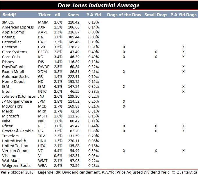 Voor beleggers die de ‘originele’ theorie van de Dogs of the Dow willen volgen, zijn dit nu de tien aandelen die u moet kopen: Pfizer, Coca-Cola, Cisco Systems, Verizon Communications, Procter & Gamble, Exxon Mobil, J.P. Morgan Chase, Chevron, International Business Machines en McDonald’s, waarbij de eerste vijf in chronologische volgorde optisch de goedkoopste aandelen van het tiental zijn. Bent u echter overtuigd over de aanpak met de Price Adjusted Dividend Yield dan zijn Pfizer, Coca-Cola, Intel, Cisco Systems, Verizon, DowDuPont, Merck, Walgreen Boots, Nike en Procter & Gamble de aandelen die u nu moet hebben.
