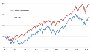 Op het eerste gezicht ben je misschien geneigd te zeggen van wel. Zo is er een Amerikaanse ETF gericht op de smartphone, de First Trust NASDAQ Smartphone Index Fund, die vanaf 2011 tot 2019 (eerste publicatie artikel) een rendement heeft behaald van +70,6% inclusief dividend. Niet slecht, maar een belegging in een S&P500 ETF, die de brede index volgt, had over diezelfde periode een rendement van +138,5% opgeleverd – bijna het dubbele dus. Deze zeer succesvolle trend heeft beleggers dus opgezadeld met een benedengemiddeld resultaat.