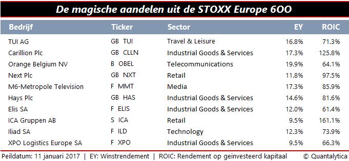 Hoewel de beleggingsstrategie eenvoudig van opzet is en Joel Greenblatt de uitleg helder op schrift heeft gezet, is de praktische uitvoering niet zo gemakkelijk dat een kind de was kan doen. Omdat voor Europese bedrijven kerncijfers als bedrijfsresultaat, ondernemingswaarde, netto-activa en werkkapitaal niet voor het oprapen liggen, volgt hieronder een overzicht met de aandelen die op dit moment op deze punten opvallend goed scoren.