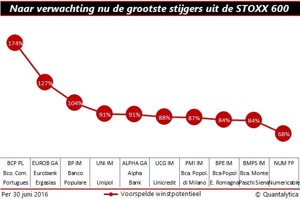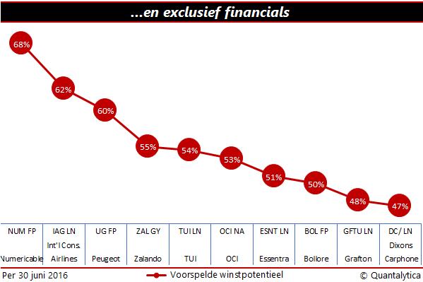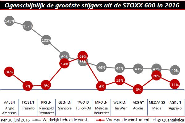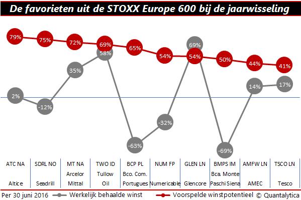 Eind 2015 schoven analisten tien Europese fondsen naar voren, waaronder Altice en ArcelorMittal, als hun favoriet aandeel voor het nieuwe beursjaar. Het gemiddelde koersdoel gaf ogenschijnlijk aan dat ze ultimo 2016 pak ‘m beet 60 procent hoger zouden noteren dan op 31 december 2015. Inmiddels is bekend dat het acht van de tien favorieten anders gelopen is. Enkel het Ierse Tullow Oil en het Britse mijnbouwbedrijf Glencore konden min of meer voldoen aan de hooggespannen verwachtingen van analisten. Als groep echter zakte het tiental met het hoogste koersdoel collectief door het ijs, met een gemiddelde winst van 1,9 procent.