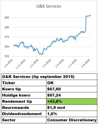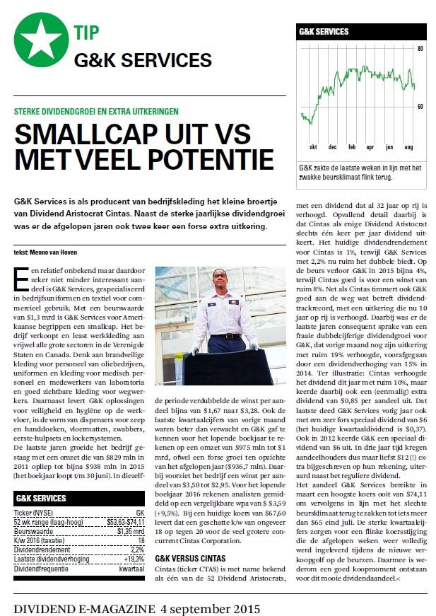 In het Dividend E-Magazine van september 2015 werd de Amerikaanse smallcap G&K Services opgevoerd als kooptip op $67,60. na een flinke koersdaling in de voorliggende periode.