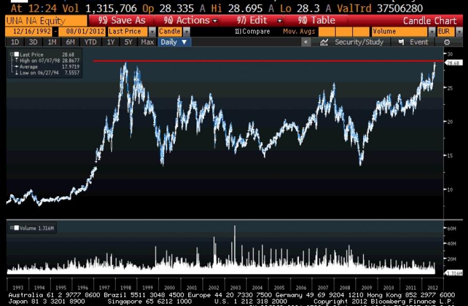 Vandaag (dinsdag) werd intraday al een niveau van €28,74 aangetikt, waarmee een nieuw record wel heel erg dichtbij is gekomen. Nadat Unilever vorig jaar één van de best presterende Nederlandse aandelen was staat er in 2012 nu ook alweer 7,4% rendement op het bord, nog exclusief dividend. Dat dividend maakt Unilever nu juist zo'n interessant aandeel (zie dividendportefeuille).