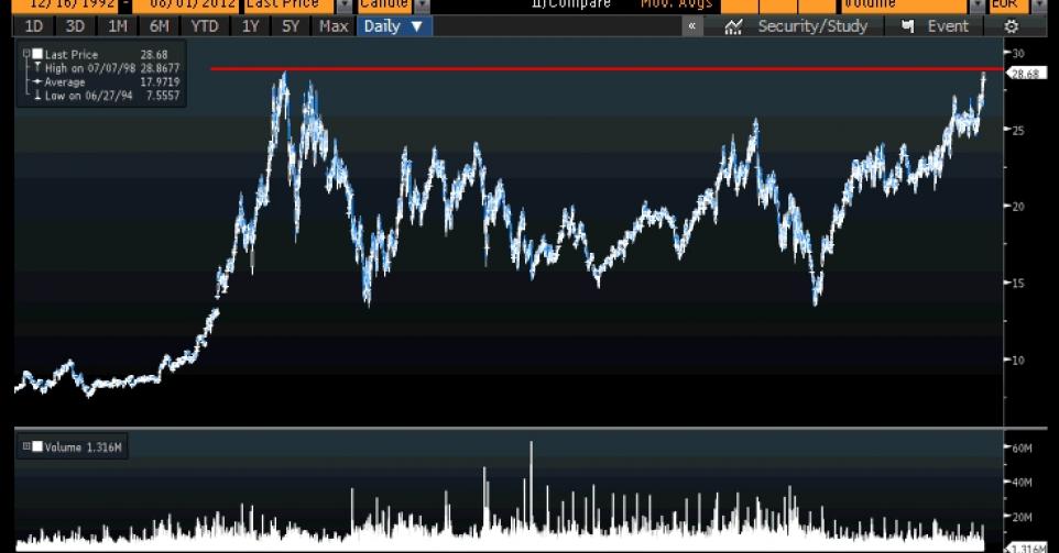 Eén aandeel staat zelfs op enkele centen van een hoogste koers ooit: Unilever. Als we terugkijken in de historie zien we dat er in juli 1998 een hoogste koers van €28,87 werd neergezet (zie grafiek).