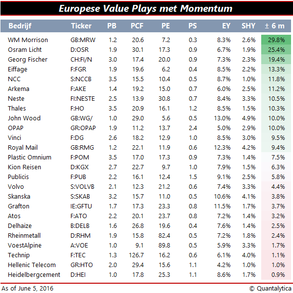 Onderstaande lijst is een overzicht van Europese fondsen die op dit moment voldoen aan de eisen van O’Shaughnessy. Het normaantal van 25 is echter op maat geschreven van Wall Street, de grootste marktplaats voor aandelen ter wereld. Vertaald naar de Europese effectenmarkten, meer bepaald de STOXX 600, lijkt in onze contreien een selectie van 10 aandelen gepast voor de Europese variant van Trending Value.