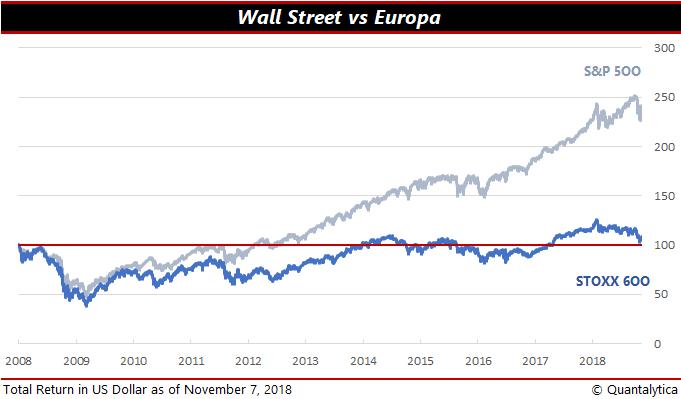 Los van het feit of oktober al dan niet de slechtste beursmaand sinds 2008 was, valt op dat tien jaar na de crisis de kloof tussen Wall Street en de Europese aandelenmarkten alleen maar groter is geworden. De Amerikanen zijn sterk in het exporteren van hun problemen. Zij lokten met hun rommelhypotheken de kredietcrisis uit, hun consumptie drijft de handelsoorlog met China op de spits – maar dat terzijde – et cetera.