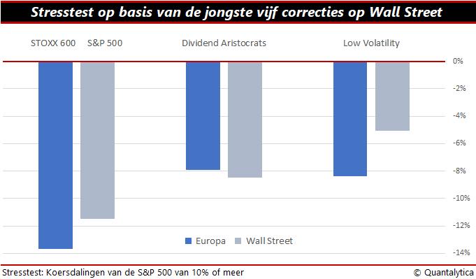 Elk nadeel heeft echter ook z’n voordeel. De andere kant van de medaille is dat zogeheten defensieve aandelen in turbulente tijden minder hard dalen dan andere. Wie naar de jongste vijf correcties van 10% of meer kijkt, ziet dat hoogvolatiele aandelen in de regel de koersdalingen van de S&P500 bekopen met 20% verlies. Terwijl door de bank genomen de averij onder laagvolatiele aandelen en dividendaandelen beperkt blijft tot 8%.