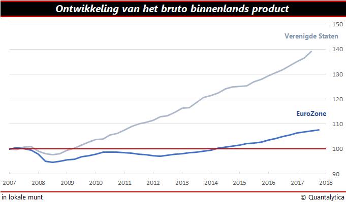 De economieën van de Verenigde Staten kenden tussen 2008 en 2017 per saldo een voorspoedige groei. Het bruto binnenlands product steeg in de periode met 35%, ofwel op jaarbasis iets meer dan 3%. Die groeicijfers staan in schril contrast met de percentages van de eurozone. De nominale groei van de Europese economieën stokt op 6,4%. Dat komt nauwelijks overeen met een jaargemiddelde van 0,7%.