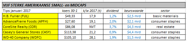 Het jaar 2016 verliep uitstekend voor Amerikaanse smallcaps met uiteindelijk forse koerswinsten voor de vijf tips van het Dividend E-magazine van december 2015. Desondanks zijn er nog genoeg kansrijke aandelen die met het oog op de lange termijn gekocht kunnen worden. Net als inmiddels ruim een jaar geleden bekijk ik vijf veelbelovende Amerikaanse smallcaps. In februari zal ik hetzelfde doen voor Europa.