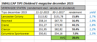 Allereerst een korte terugblik op de 5 smallcaps van inmiddels ruim een jaar geleden. In het Dividend E-magazine van december 2015 bekeek ik achtereenvolgens Lancaster Colony (levensmiddelen), Resmed (medische apparatuur), Crane (industrie, o.m. vliegtuigonderdelen), Clarcor (industrie, filtratieproducten) en Columbia Sportswear (outdoorkleding en schoenen).