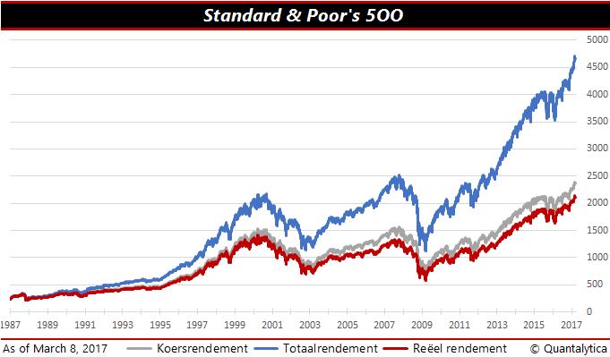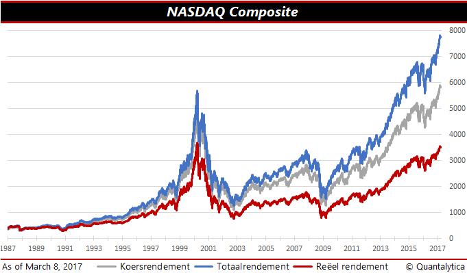 Al met al heeft de NASDAQ 15 jaar moeten wachten op een nieuw hoogterecord. Ten langen leste tekende de Nazzie op donderdag 18 juni 2015 een all-time high maar noch die, noch die van dinsdag 1 maart 2017 (de meest recente) is dat echt. Als u rekening houdt met de inflatie en dividenden, dan is dat ceteris paribus pas bij 6146,95 punten het geval. De NASDAQ heeft dus nog zo’n vijf procent te gaan. De S&P500 passeerde het break-even punt al op woensdag 8 mei 2013 bij een stand van 1628,09 punten.