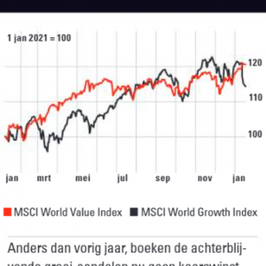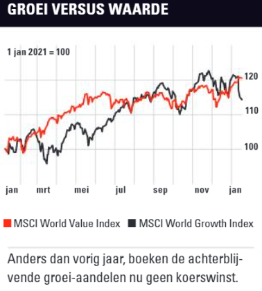 Toch zijn de eerste handelsdagen van dit jaar geen exacte kopie van begin 2021. Want vorig jaar bleven groei-aandelen weliswaar ook achter bij waarde-aandelen, maar boekten ze per saldo wel koerswinst in de eerste dagen van januari. Dat is nu anders. De MSCI World Value Index boekte dit jaar (in dollars gemeten) een winst van 1,2%, terwijl de MSCI World Growth Index 4,6% in de min staat.