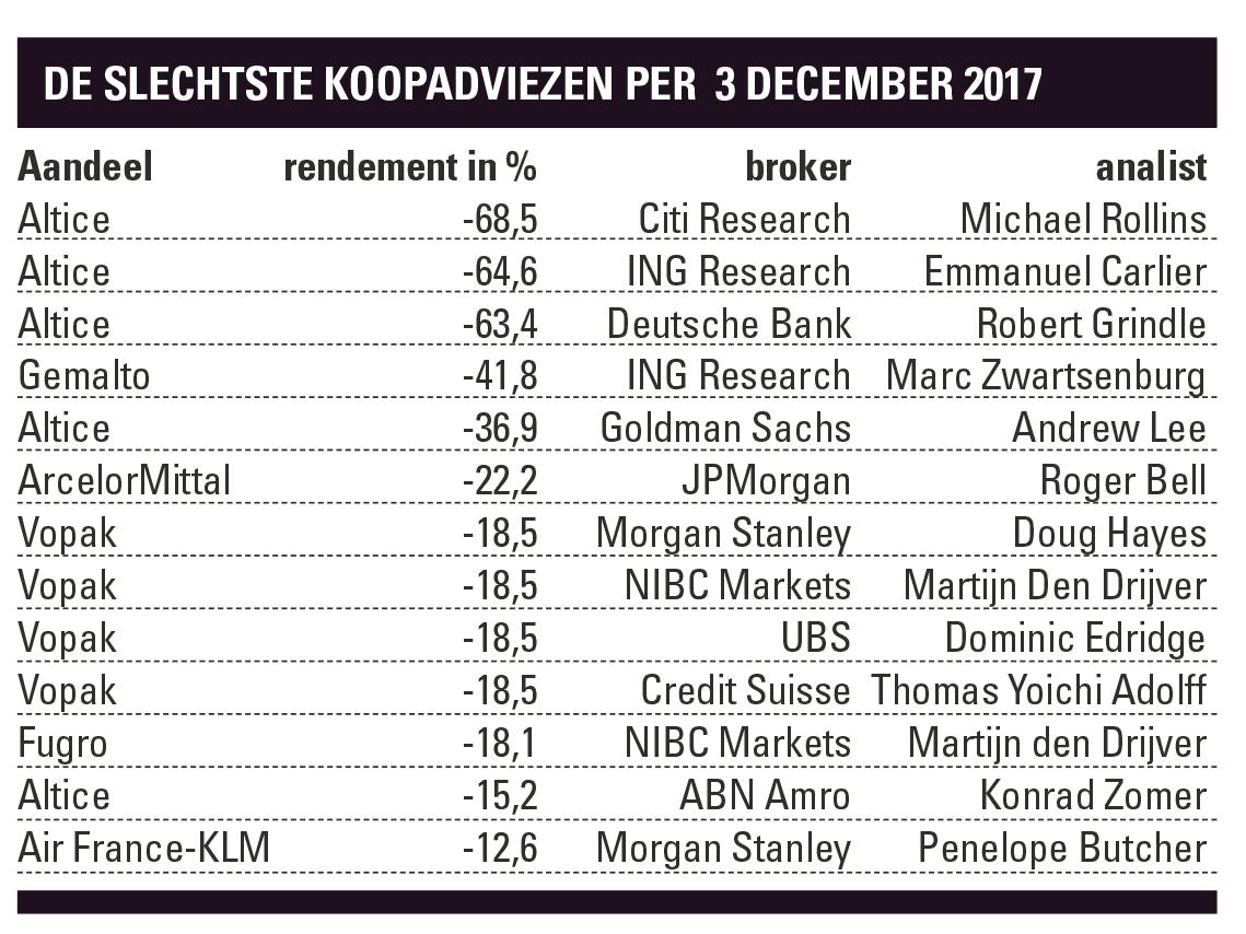 In de top-10 van slechtste kooptips wordt het podium bezet door drie analisten die alle drie op een bepaald moment in het jaar Altice aanbevolen bij hun klanten. Afhankelijk van het instapmoment verspeelden ze daarmee tussen de 60 en 70% van de inleg. Michael Rollins van Citi Research (-68,5%), Emmanuel Carlier van ING (-64,6%) en Robert Grindle van Deutsche Bank (-63,4%) valt deze twijfelachtige eer ten deel.