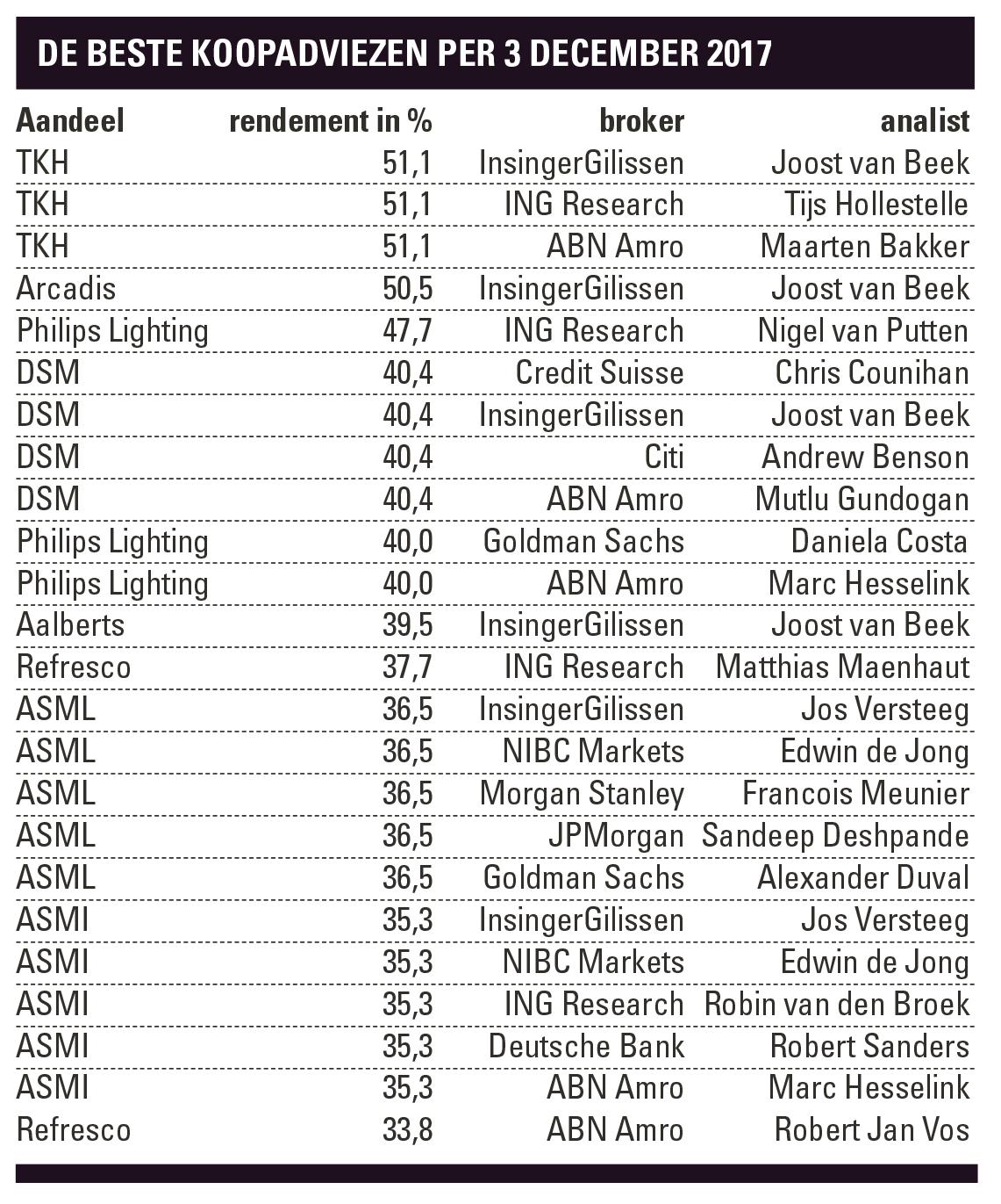 Wat waren de beste kooptips van 2017? De beste tip werd gegeven door een trio analisten dat TKH al vanaf vorig jaar op ‘kopen’ had staan. Joost van Beek (InsingerGilissen), Tijs Hollestelle (ING Research) en Maarten Bakker (ABN Amro) lieten hun klanten het gehele jaar profiteren van het aandeel, dat in november de hoogste koers ooit bereikte. Tot en met 3 december bedroeg het totaalrendement +51,1%.