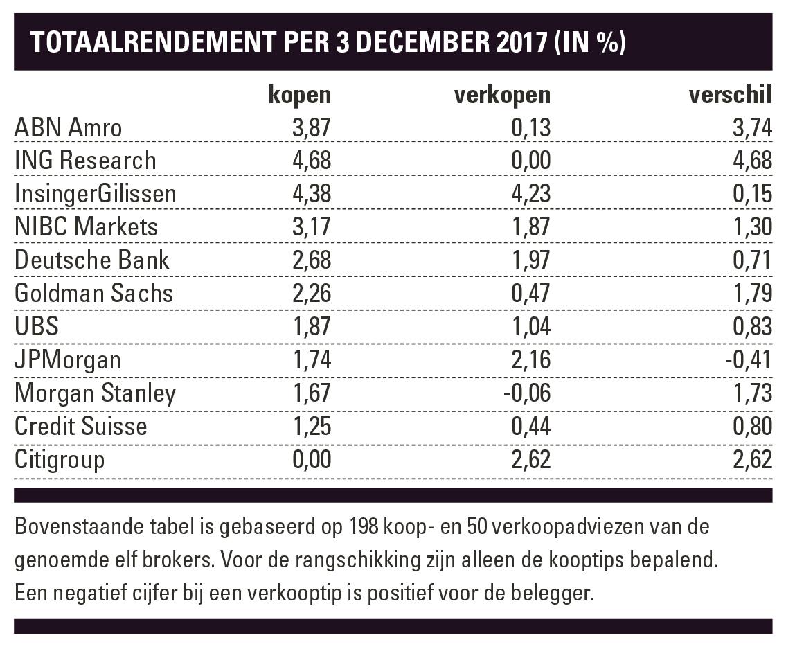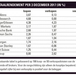 Samenvattend was het een jaar waarin per saldo de koopadviezen van alle elf brokers winstgevend waren. Alleen Citigroup en Morgan Stanley wisten zich ook te onderscheiden met hun verkooptips. Een en ander hangt natuurlijk nauw samen met het positieve beursklimaat dit jaar. We blijven ook volgend jaar de analistenadviezen voor u volgen en zullen halverwege 2018 opnieuw verslag uitbrengen.