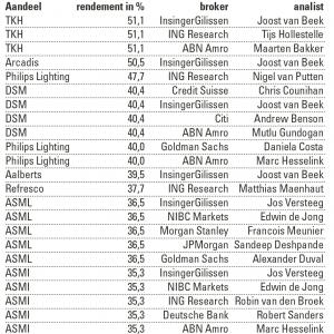 Ook Nigel van Putten (ING Research) was als analist goed bezig, met zijn koopadvies sinds eind vorig jaar op Philips Lighting (+47,7%). Om dit rendement te bereiken, bleek de adviesverlaging (naar ‘houden’) op 16 juni essentieel. Een week eerder had de voormalige lichtdivisie van Philips namelijk de hoogste stand ooit bereikt, om vanaf dat moment wat in te zakken en door te kabbelen. Een fraaie podiumplaats.