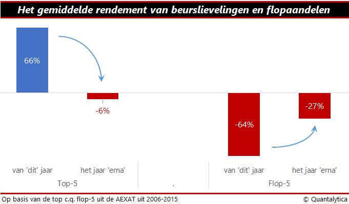 Nee, het zijn zeker geen domme vragen; het zijn vragen die passen bij de tijd van het jaar. Er kan in de loop van 2017 veel gebeuren, maar uit historische simulatie met Nederlandse aandelen op basis van de AEX Alltradables (AEXAT), de verzamelindex van hoofdfondsen, Midkappers en smallcaps, komt naar voren dat het in de voorbije tien jaar met de beurslievelingen het jaar daarop slecht afliep. Door de bank genomen lieten zij op jaarbasis een veer van -6,4%.