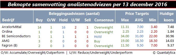 En wat denken zij van de winnaars van dit jaar? Het motto Buying on strength, selling on weakness wordt in de praktijk door veel technische analisten toegepast. De fundamentele analisten zijn nog steeds te spreken over deze aandelen, maar de lat van het gemiddelde koersdoel ligt lager. Het opwaartse koerspotentieel ligt met 9,6% een stuk lager ondanks het feit dat de onderliggende beleggingsopinies zoals uit de consensus blijkt positiever zijn.