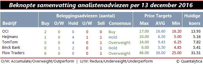 Daartegenover staan de koersprestaties van OCI, Heijmans, TomTom, Binck Bank en Flow Traders. Om uiteenlopende redenen leverden de betrokken aandelen door de bank genomen 34% aan waarde in.