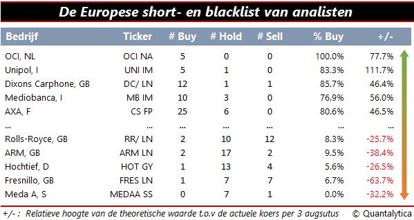 Eenzelfde gedachtegang (percentage koopaanbevelingen en stijgingspotentieel) toegepast op de STOXX Europe 600, de facto de verzamelindex van telkens de 200 belangrijkste Europese smallcaps, midkappers en largecaps, resulteert in onderstaande short- en blacklist. Met andere woorden: de lijst met de favoriete en de meest gehate Europese aandelen van analisten.