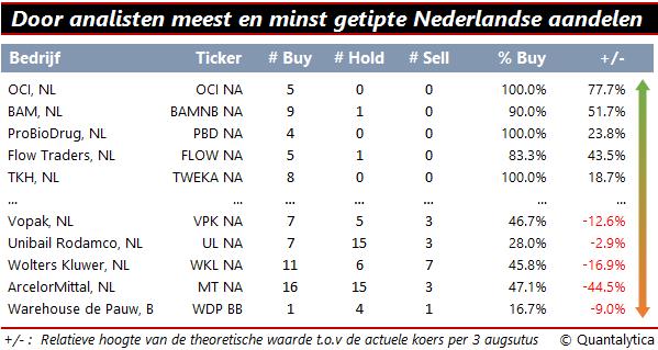 Wanneer u zowel de maat neemt van het aantal koopadviezen alsook de hoogte van het gemiddelde koersdoel van analisten, dan trekken Nationale Nederlanden, OCI en ProBioDrug bij respectievelijk de AEX, AMX en AScX-fondsen aan het langste eind. De drie indices vormen samen de AEX All Tradable-index, kortweg AEXAT geheten. Dit is de verzamelindex van de 75 grosso modo meest verhandelbare aandelen op Beursplein 5. Onderstaande tabel geeft een overzicht met de door analisten de meest dan wel minst getipte Nederlandse aandelen.