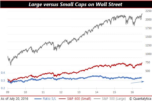 In Europa zitten smallcaps al sinds anderhalf jaar in de lift, maar op Wall Street out-performen zij de largecaps na een maandenlange pauze in 2015 opnieuw sinds februari van dit jaar. Aangezien aan weerszijden van de Atlantische Oceaan de koersen van het kleine grut stijgen, duidt dit erop dat beleggers nadrukkelijk naar de groeivooruitzichten van de smallcaps kijken en het hogere inherente risico voor lief nemen.