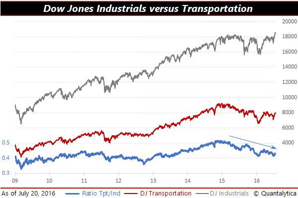 De Nederlandse slogan Zonder transport staat alles stil verheldert op ludieke wijze de logica achter de Dow Theory, een van de oudste beleggingstheorieën ter wereld. Zoals elke theorie behelst de Dow-theorie een aantal uitgangspunten. Het valt buiten de doelstelling van dit artikel om daarop in detail in te gaan, maar het zegt onder andere dat de gemiddelden elkaar moeten bevestigen. Er bestaat een verband tussen het gemiddelde van de industriële aandelen en het gemiddelde van de transportbedrijven. De gedachte is dat een economie zich niet kan ontwikkelen als grondstoffen en goederen niet naar fabrieken en de markt vervoerd worden. Dus als de stijging van de Dow Jones Industrials niet door de Dow Jones Transportation Average wordt voorafgegaan, dan is die stijging een kort leven beschoren.