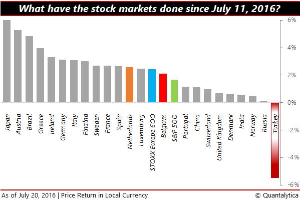 Per saldo noteert de S&P500 nu zo’n procent hoger dan de all-time high van zeg maar een week geleden. De Europese effectenbeurzen doen globaal genomen zelfs 2,5 procent. Maar zoals zo vaak gaan achter een gemiddelde grote verschillen schuil. Zo noteert in Wenen de markt pak hem beet vijf procent hoger en in het buurland Zwitserland amper één procent. Of neem nu Brazilië versus Rusland. Oké, zij behoren niet tot de Europese Unie, noch zijn het buren, maar de twee zijn beduidende leveranciers van grondstoffen en hun economieën staan ondanks alle politieke problemen immer nog te boek als belangrijke groeimarkten. Ook Turkije is een groeimarkt, maar de mislukte staatsgreep van vorig week is allesbehalve een warm bad voor Turkse aandelen, noch voor de Turkse pond.