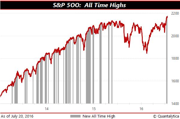 Op maandag 11 juli zette de S&P500 eindelijk weer een nieuw hoogterecord neer. De vorige dateert van woensdag 20 mei 2015 en was de 113de all-time high in de huidige bull-run. De teller staat inmiddels op 119. Want ook in de (handels)dagen erna verkende de beursgraadmeter met de 500 belangrijkste bedrijven van de Amerikaanse economie nieuwe hoogtes.