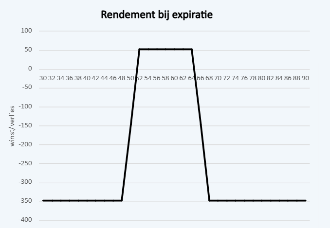Het risico en het maximale verlies van deze positie is €347. Dit wordt bereikt als ASR bij expiratie op of onder de €52 staat of op of boven de €64. Dit verlies bestaat uit de €4 verschil in uitoefenprijs aan de boven- of onderkant (€52-€48 en €68-€64). Door de hefboom van 100 die in deze opties zit, komt dat neer op €400 per positie. Hier mogen we het reeds ontvangen bedrag van €53 vanaf trekken.