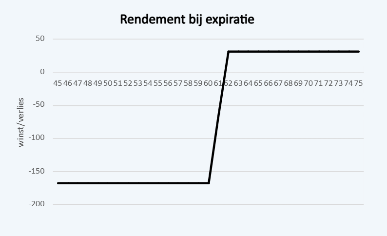 Het break-even punt ligt op €61,68. Als we op 19 december precies op dat niveau expireren, dan is het resultaat precies €0.