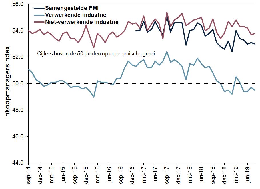 Bron: FactSet en Nationaal bureau voor de statistiek, per 11/9/2019. PMI’s van de verwerkende en niet-verwerkende industrie, september 2014 – augustus 2019, en de samengestelde PMI, januari 2017 – augustus 2019.