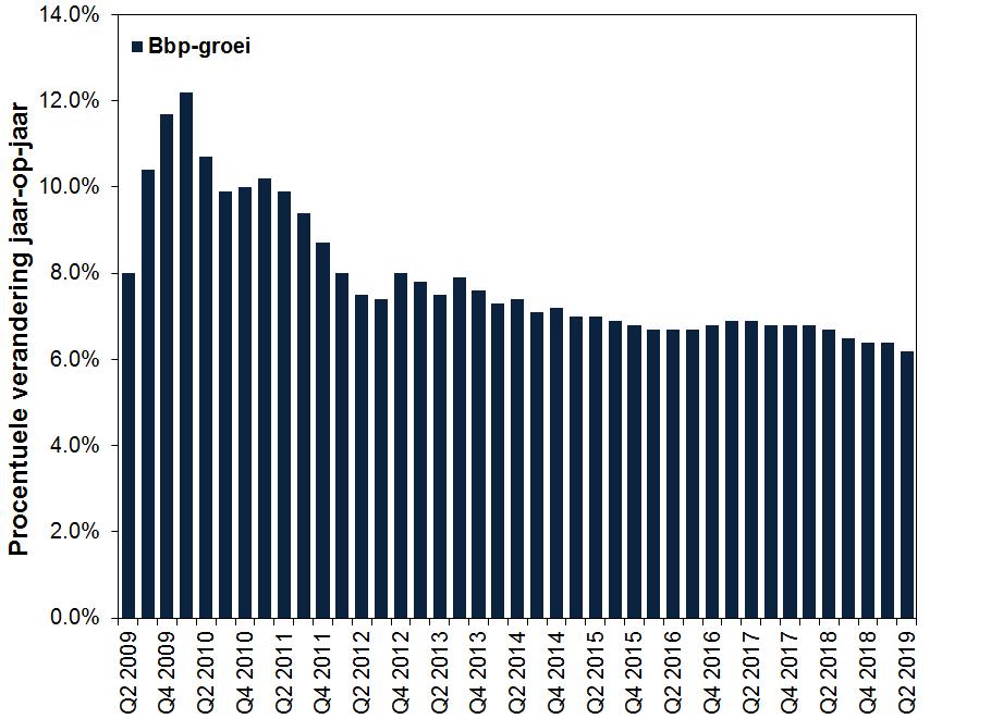Bron: FactSet, per 10/9/2019. Procentuele verandering jaar-op-jaar van het Chinese reële bbp, 2e kw. 2009 – 2e kw. 2019.