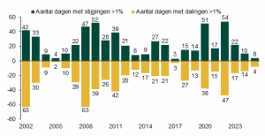 Bron: FactSet, per 12-03-2025. Totaal aantal schommelingen van 1% in de MSCI World Price Index, dagelijks, van 01-01-2002 t/m 11-08-2024.
