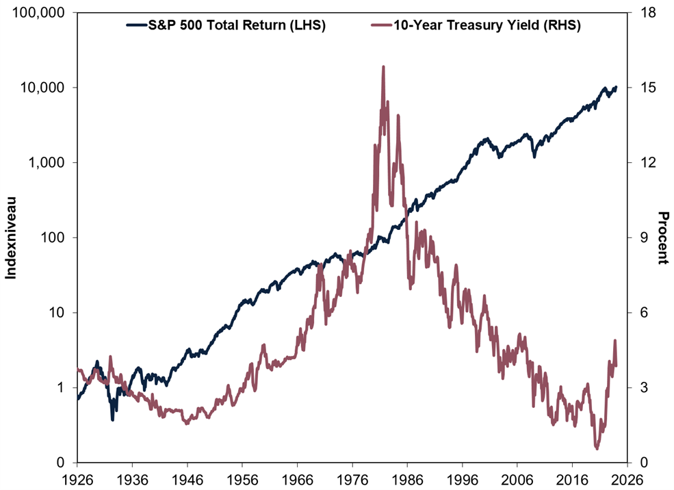 Bron: FactSet, per 11-01-2024. Totaalrendement van de S&P 500 en Amerikaanse 10-jaarsrente, december 1925 t/m december 2023. Weergegeven in USD. Schommelingen in de wisselkoers tussen de dollar en de gulden kunnen leiden tot hogere of lagere beleggingsrendementen. De linker-as is in logaritmische schaal met basis 10, waarmee we procentuele veranderingen incrementeel weergegeven hebben.