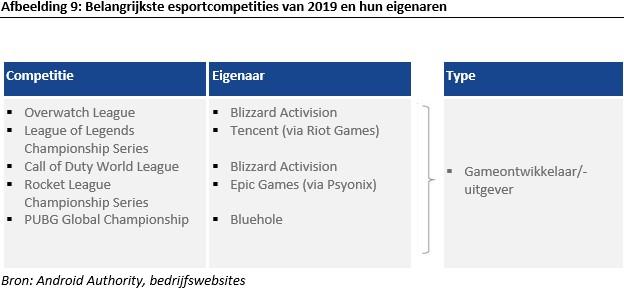 Wanneer we kijken naar esport, zien we dat de eigenaren van de belangrijkste competities ook gameontwikkelaars en -uitgevers zijn. Ook zij zijn dus goed gepositioneerd om te profiteren van de groei (zie afbeelding 9).