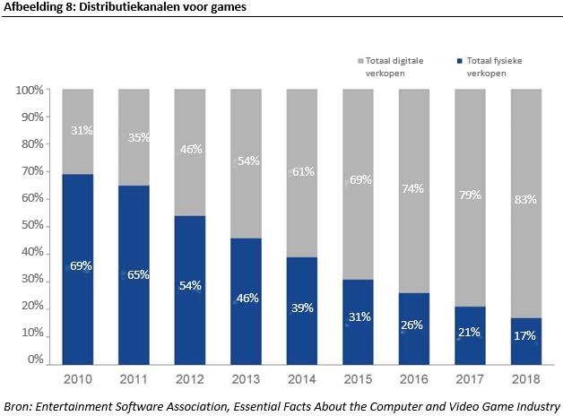 Distributie gebeurt in toenemende mate digitaal. Ook ten aanzien van deze ontwikkeling zijn gameontwikkelaars en -uitgevers, samen met cloudplatforms, het best gepositioneerd (zie afbeelding 8).