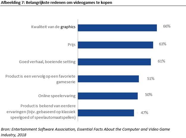 Afbeelding 7 laat zien dat de volgende factoren een belangrijke rol spelen bij het aanschaffen van een game: de hardware, de prijs, het verhaal, de continuïteit van een serie en de online speelervaring. De laatste vier factoren liggen in handen van gameontwikkelaars en -uitgevers. Een interessant gegeven is dat intellectueel eigendom als laatste wordt genoemd, waarbij overigens intellectueel eigendom vaak is gecreëerd door uitgevers, zoals het Mario-personage van Nintendo.