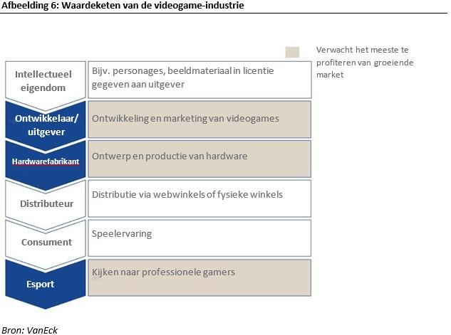 Welke bedrijven kunnen het meeste profiteren wanneer de videogame-industrie volgens de geschetste prognoses groeit? We kunnen dit analyseren aan de hand van de waardeketen. Wanneer we kijken naar de zes stappen in de waardeketen van de videogame-industrie, verwachten we de meeste waardegroei bij gameontwikkelaars en -uitgevers en bij hardwarefabrikanten. Dit realiseren ze hetzij rechtstreeks, hetzij via hun rol binnen de esport-sector.