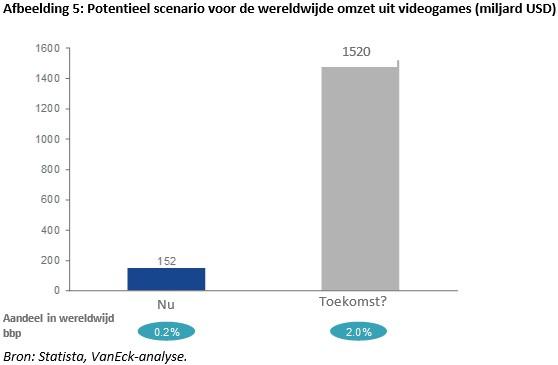 Wanneer we aannemen dat het aandeel van videogaming zal groeien naar 2% van het wereldwijde bbp, zal de huidige omzet van de videogame-industrie vertienvoudigen. We moeten daarbij aantekenen dat VanEck niet beschikt over onderzoeken of andere gegevens die erop wijzen dat deze prognoses werkelijkheid gaan worden.